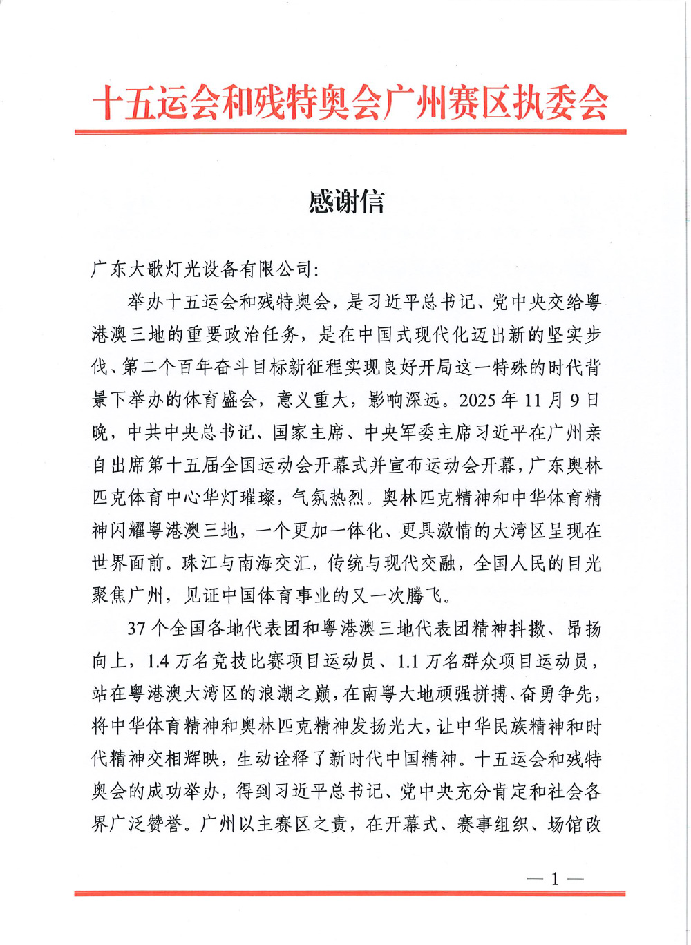 近日,【大歌灯光】收到十五运会和残特奥会广州赛区执委会发来的感谢信,对公司为赛事开闭幕式及场馆照明保障工作提供的专业支持与技术服务给予高度肯定。