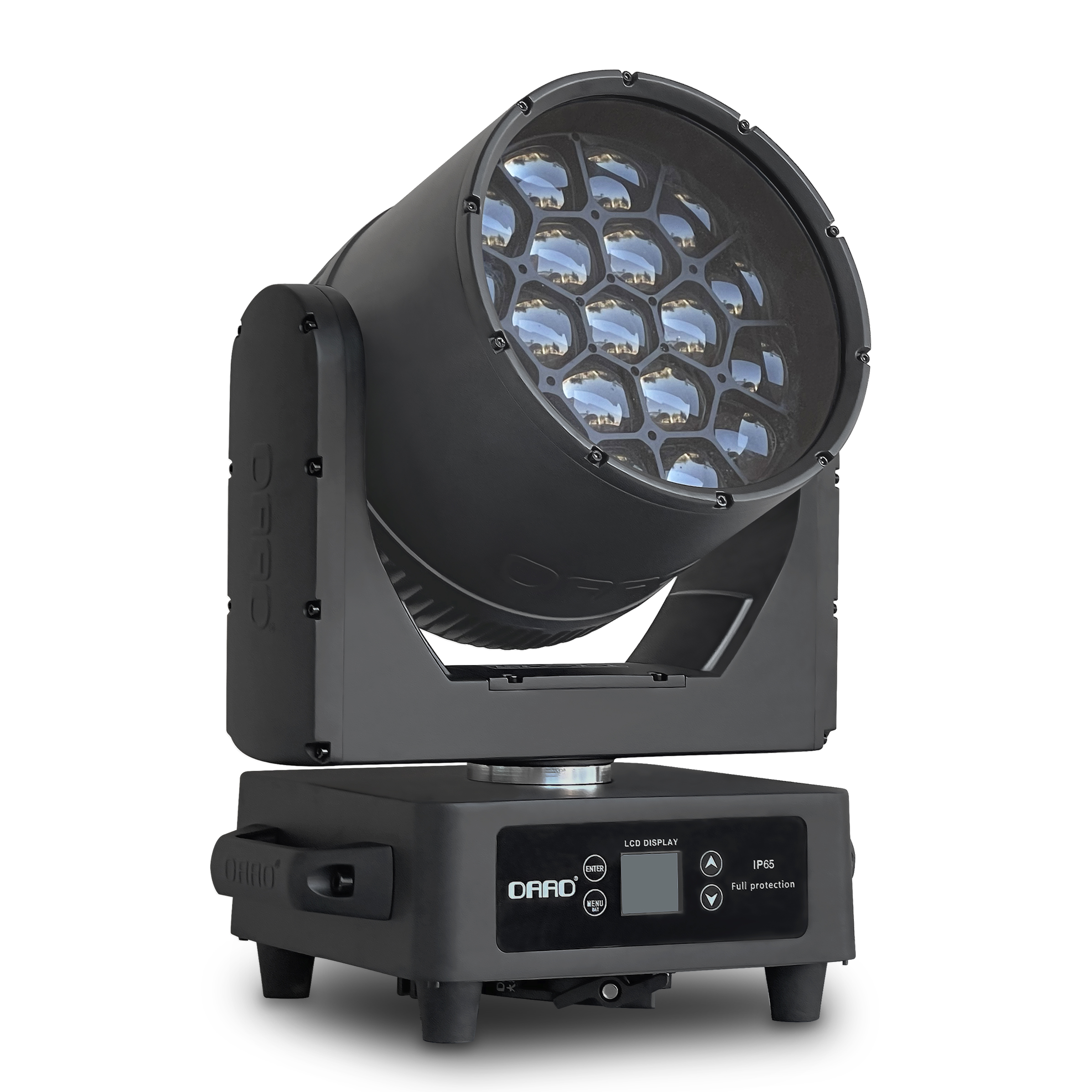 防水AA-1940(19X40W)摇头染色蜂眼灯,是一款高亮度、高性能、长寿命的镁合金结构的防水LED全彩调焦摇头蜂眼染色灯。采用19颗40W高亮度RGBW的LED灯珠,高品质玻璃导光棒与分体耐高温PMMA光学透镜,4.5-43开光角度。XY轴使用强劲有力,快而平稳静音的三相电机与霍尔、磁编码器双定位系统。高精度的恒流智能控制系统,16位65536级平滑调光精度,高调光频率无闪烁、无抖动现象。22/87个通道控制模式,具有RDM数据双向传送功能,支持点控、圈控、跑马、跳变、渐变和透镜组旋转等染色、光束图形效果。预设一键面光及全时10000K-2000K色温调节效果,可满足不同场景的需求使用。LCD彩色液晶显示屏,可通过菜单调用内置宏功能,可编辑彩虹、可变频闪、电动调光等功能效果。选用输入功率1000W,输出电压36V的开关电源。手拉手3米电源线(国标2.5平方)和手拉手3米信号线(国标96网)。
